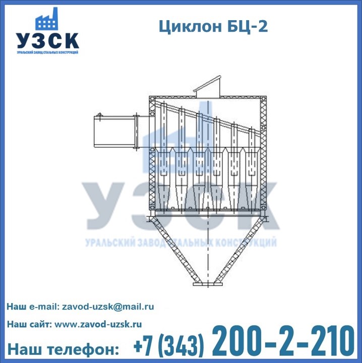 Батарейные циклоны БЦ-2 представляют собой пылеулавливающие агрегаты, в конструкцию которых, в обязательном порядке, входят подвод и отвод газов, а также сборный бункер. Модель БЦ-2 более компактна, по сравнению со стандартными моделями циклонов, и отличается меньшими размерами, но при этом не менее эффективна и производительна.
